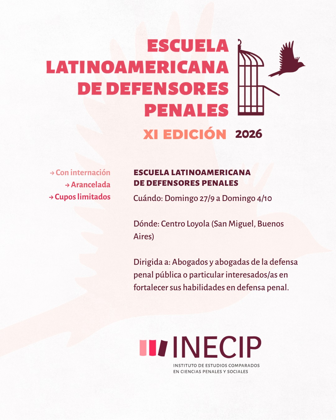La Escuela Latinoamericana de Defensores Penales y el Instituto de Estudios Comparados en Ciencias Penales y Sociales (INECIP) los/as invita a participar a la XI Escuela Latinoamericana de Defensores y Defensoras Penales para abogados y abogadas de la defensa penal pública o particular.
