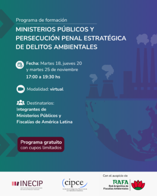 El Instituto de Estudios Comparados en Ciencias Penales y Sociales (INECIP) y su Centro de Investigación y Prevención de Criminalidad Económica (CIPCE) invitan a postularse al Programa de Formación gratuito “Ministerios Públicos y persecución penal estratégica de delitos ambientales”, que se desarrollará en el marco del proyecto “Investigación, litigio y participación comunitaria en la persecución penal de la dimensión económica de los delitos ambientales”. La actividad cuenta con el auspicio de la Red Argentina de Fiscalías Ambientales (RAFA).