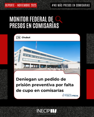 En la provincia de Chubut, la crisis de alojamiento volvió a manifestarse de manera explícita en relación a una mujer imputada por tentativa de homicidio agravado, que se encontraba detenida en un establecimiento policial. Durante la audiencia de control de detención, la jueza interviniente dispuso su libertad con medidas sustitutivas (presentaciones periódicas y control judicial) debido a la inexistencia de cupos disponibles para mujeres en dependencias penitenciarias y comisarías de Comodoro Rivadavia.